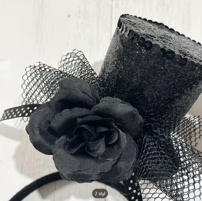 Elegantní černý mini cylindr na čelence je výrazný fascinátor, který dodá outfitu nádech glamouru a tajemství. Flitrový povrch, černá květina, jemná síťka a puntíkovaná stuha vytvářejí dramatický, ale stále ženský vzhled. Perfektní doplněk na plesy, Silvestr, dostihy, tematické party i retro akce ve stylu 20., 30. a 40. let. Lehký, pohodlný a snadno se nosí – stačí nasadit a záříš.