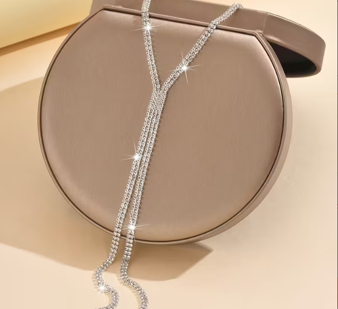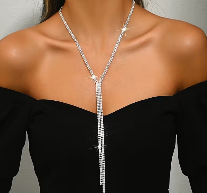 Tento stříbrný štrasový náhrdelník ve tvaru Y je dokonalým doplňkem pro ženy, které chtějí působit elegantně, smyslně a sebevědomě. Jemné linie třpytivých kamínků krásně kopírují dekolt a svislá část náhrdelníku opticky prodlužuje krk i postavu.